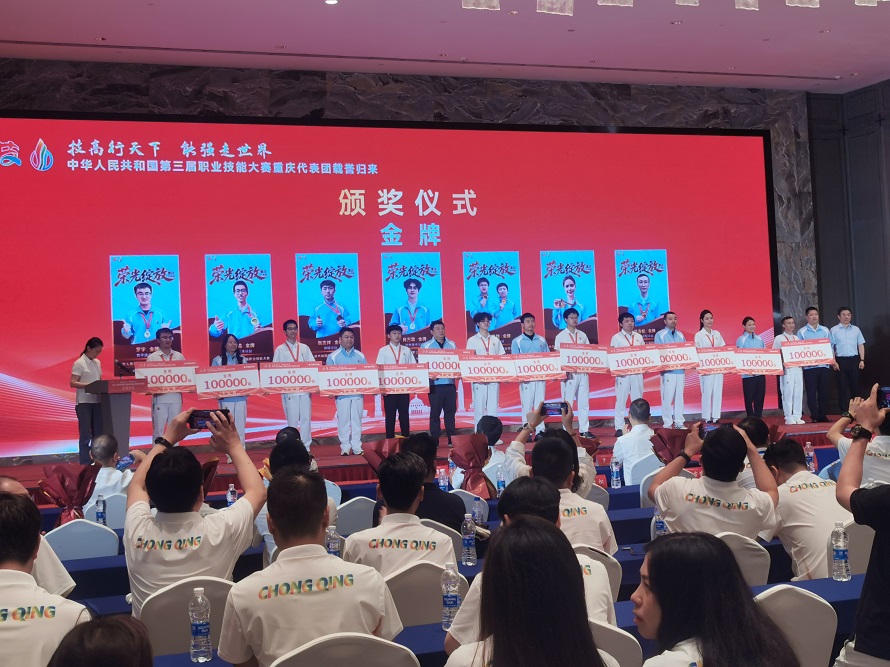 第三届全国技能大赛中,重庆技能健儿们与来自全国的技能高手过招,比匠技、比匠心,突破重重考验,最终取得7金4银1铜56优胜的历史最好成绩,1名选手获重庆代表团最佳选手奖,1名选手获西部技能之星,我市金牌数位居全国第五、西部第一,重庆代表团再次荣获“突出贡献奖”。