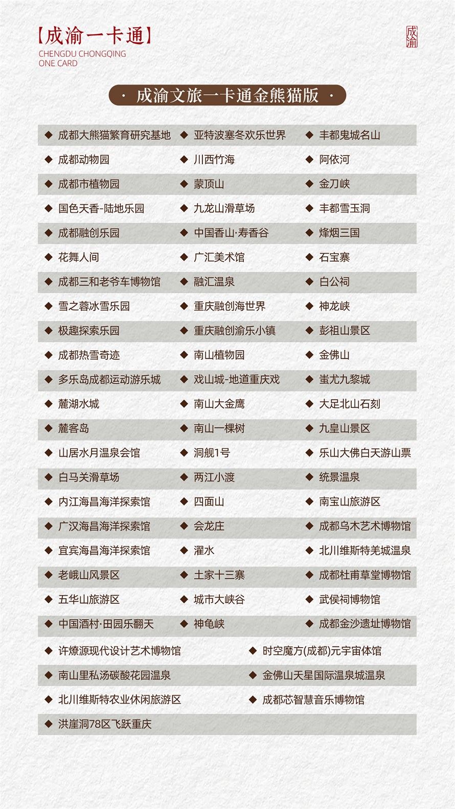 本次发布的精品线路覆盖多元旅游需求:“宽洪大量”都市之旅串联解放碑、太古里等核心商圈,“世界遗产川味之旅”融合青城山、大足石刻等自然遗产与川菜美食,“巴蜀红色印记之旅”聚焦红岩、邓小平故里等红色地标,“渝你相约”Citywalk则解锁半山崖线等城市新兴打卡点。特别推出的成渝一卡通,涵盖两地融创乐园、大熊猫繁育研究基地、统景温泉等超50个热门景区及文旅项目,实现“一卡畅游双城”。