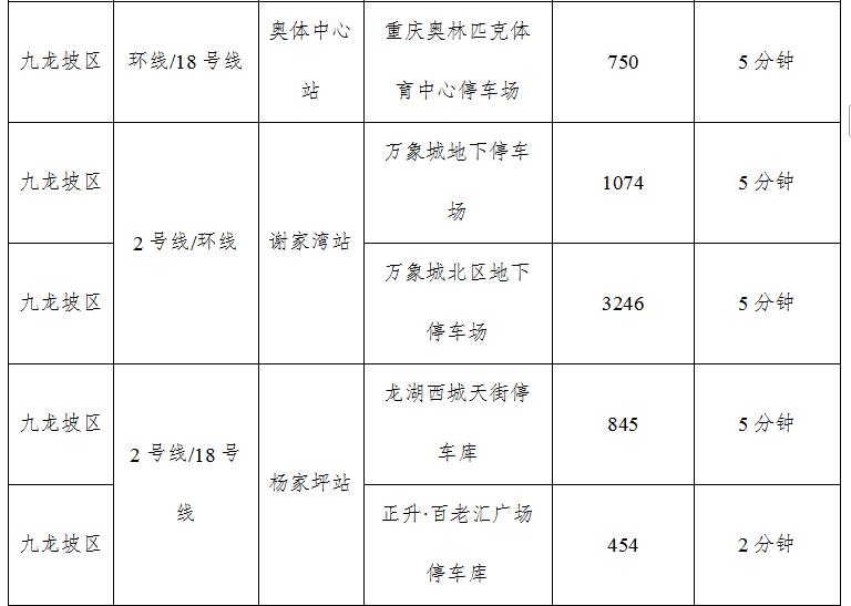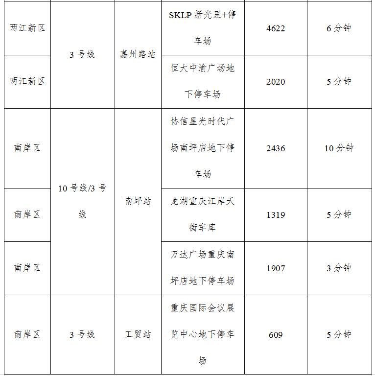 记者从重庆市停车管理事务中心获悉,本次跨年夜推出“P+R”停车换乘服务,覆盖5大区域共28个停车场(36420个停车位)。其中,两江新区6个停车场(11858个停车位)、沙坪坝区4个停车场(4060个停车位)、渝中区4个停车场(5953个停车位)、九龙坡区5个停车场(6369个停车位)、南岸区9个停车场(8180个停车位)。所有停车场均已完善步行至轨道入口的指示标识(步行时间最短2分钟、最长18分钟),相关部门同步实现停车场饱和度数据共享,将通过“定制导航”实时推荐闲置车位,保障市民停车换乘顺畅。