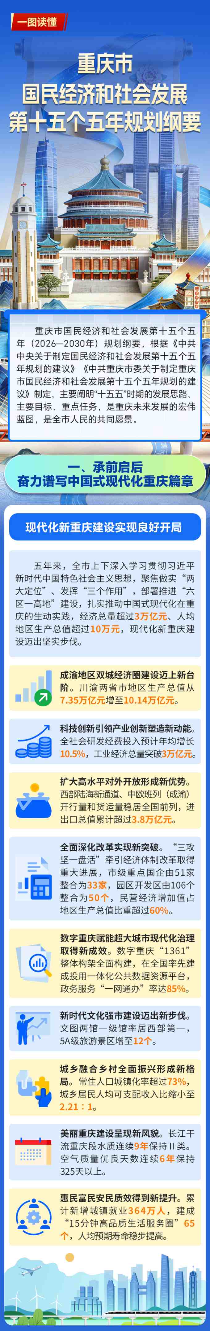 重庆与世界网讯(记者 贺煜)2月26日,《重庆市国民经济和社会发展第十五个五年规划纲要》对外公布,明确了“十五五”时期重庆经济社会发展的主要目标、重点任务。