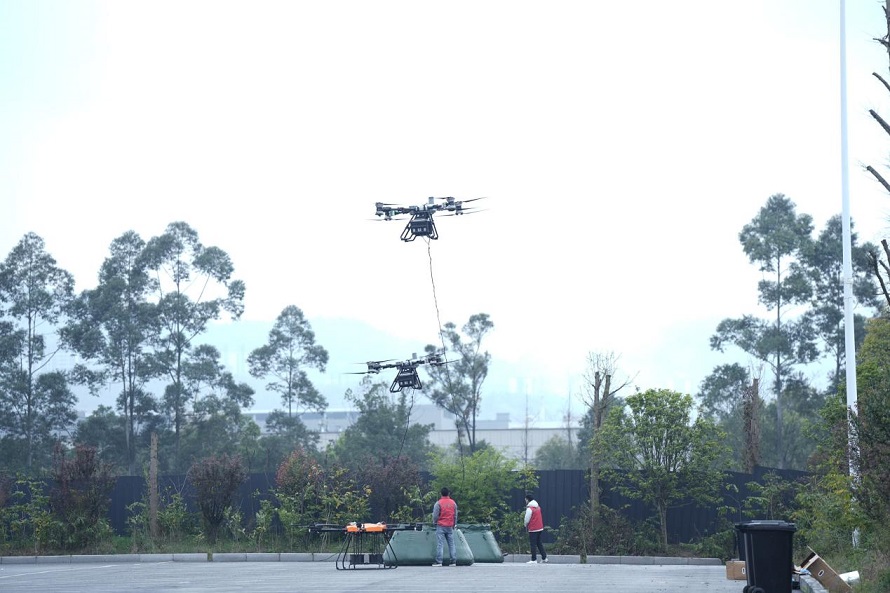 瞄准,投弹!灭火弹精准命中火点,干粉瞬间覆盖火点,明火被迅速压制。在人工与新型智能装备协同巡护演示区,大屏实时传输演练画面:机器狗按照预设路线自主巡逻,发现“火情”自动报警;侦察无人机迅速核实,获取准确坐标;投弹无人机规划最优航线,携带灭火弹直奔火点……一套“空地协同、人机联动”的流程行云流水。