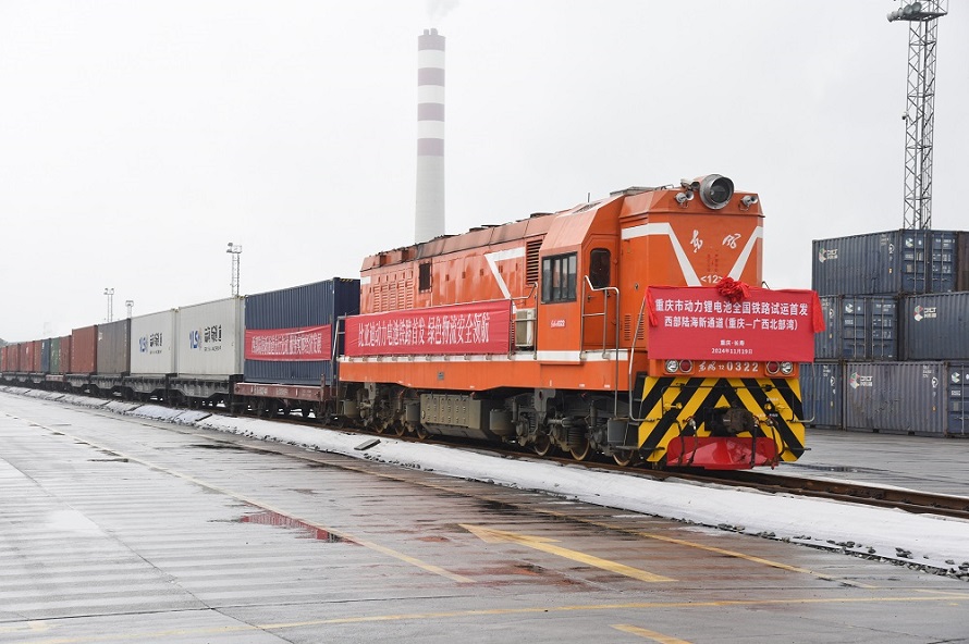 重庆与世界网讯(记者 刘丁睿)11月19日,伴随着一声汽笛长鸣,搭载有比亚迪新能源汽车动力锂离子电池的列车,从重庆长寿区渝巴专用铁路缓缓发车,驶往广西北部湾防城港新宏光铁路专用线。这是西部陆海新通道首次运输汽车动力锂离子电池,实现了铁路运输汽车动力锂离子电池的“零突破”,标志着汽车动力锂离子电池开启“铁路运输新模式”。