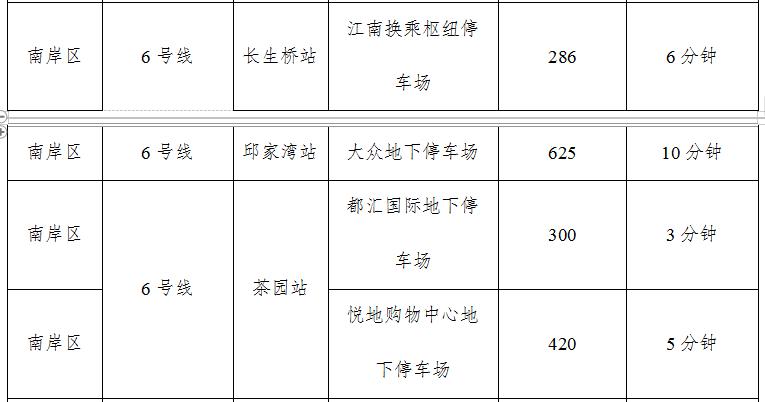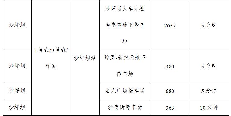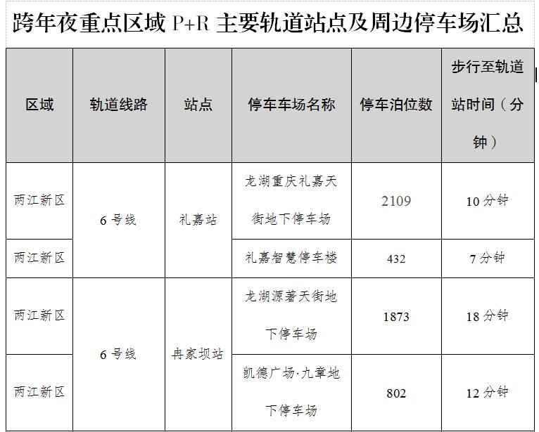 记者从重庆市停车管理事务中心获悉,本次跨年夜推出“P+R”停车换乘服务,覆盖5大区域共28个停车场(36420个停车位)。其中,两江新区6个停车场(11858个停车位)、沙坪坝区4个停车场(4060个停车位)、渝中区4个停车场(5953个停车位)、九龙坡区5个停车场(6369个停车位)、南岸区9个停车场(8180个停车位)。所有停车场均已完善步行至轨道入口的指示标识(步行时间最短2分钟、最长18分钟),相关部门同步实现停车场饱和度数据共享,将通过“定制导航”实时推荐闲置车位,保障市民停车换乘顺畅。