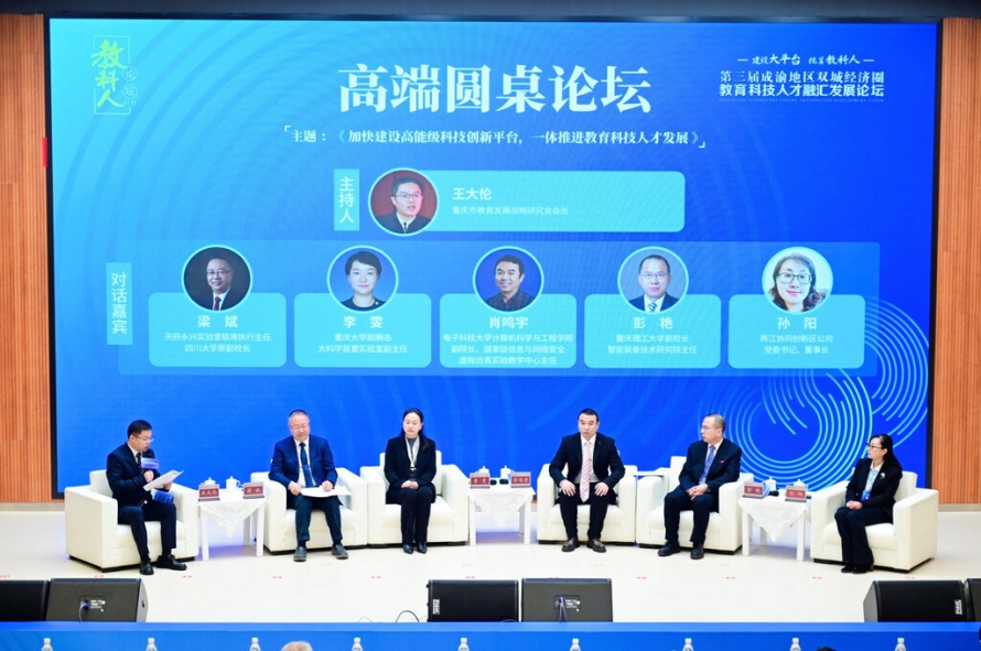 在圆桌沙龙环节,重庆市教育发展战略研究会会长王大伦与天府永兴实验室联席执行主任梁斌;重庆大学超瞬态大科学装置实验室副主任李雯;电子科技大学计算机科学与工程学院副院长、国家级信息与网络安全虚拟仿真实验教学中心主任肖鸣宇;重庆理工大学副校长、智能装备技术研究院主任彭艳;两江协同创新区公司党委书记孙阳等嘉宾,围绕“高能级科创平台”“教科人融汇”“产业发展”“生态构建”等议题展开深度对话,凝聚智慧共谋发展路径。