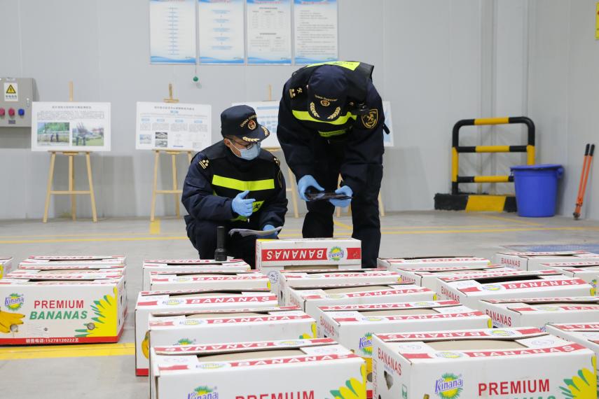 △重庆港海关关员在对进口香蕉进行现场查验。